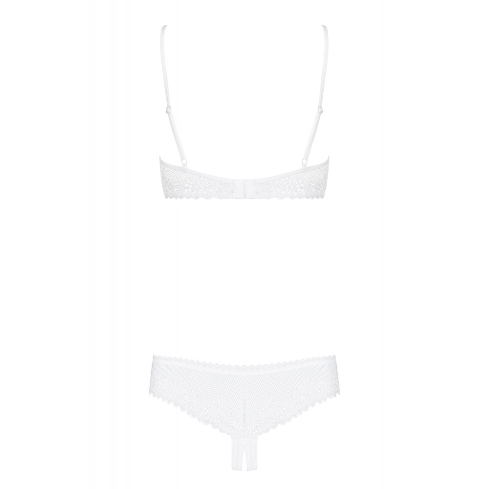 Закрийте очі і уявіть ідеальну нижню білизну, яка буде чуттєво красивою і одночасно зручною. Зручний напівбюстгальтер на кісточках і сексуальні стрінги з відкритою промежиною. Тонкий крій, делікатний матеріал і сексуальний вигляд! Додамо чарівного мережива, феноменального червоного і чарівного вирізу, і отримаємо набір з алебастру! У цій білизні ви будете сяяти повним блиском поруч зі своїм чоловіком. Бант і мерехтлива аплікація між грудьми зроблять вас шикарною, а суперсексуальне мереживо зігріє ваші почуття. Попереду вас чекає багато задоволення і любові! Познайомтеся з цим комплектом ближче: спокусливий напівбюстгальтер і відкриті стрінги білого кольору, мереживний матеріал - класична елегантність в обмеженому кольорі регульовані бретелі - зручне носіння багатоступенева застібка бюстгальтера гарантує зручну посадку чашечки на кісточках - для комфортної підтримки грудей і Сексуальна дрібничка з квітковим мереживом, вшита між чашечками з приємного матеріалу з винятковою еластичністю (90% поліамід, 10% еластан).