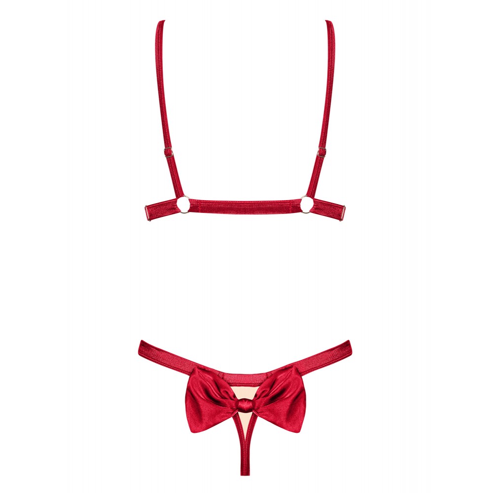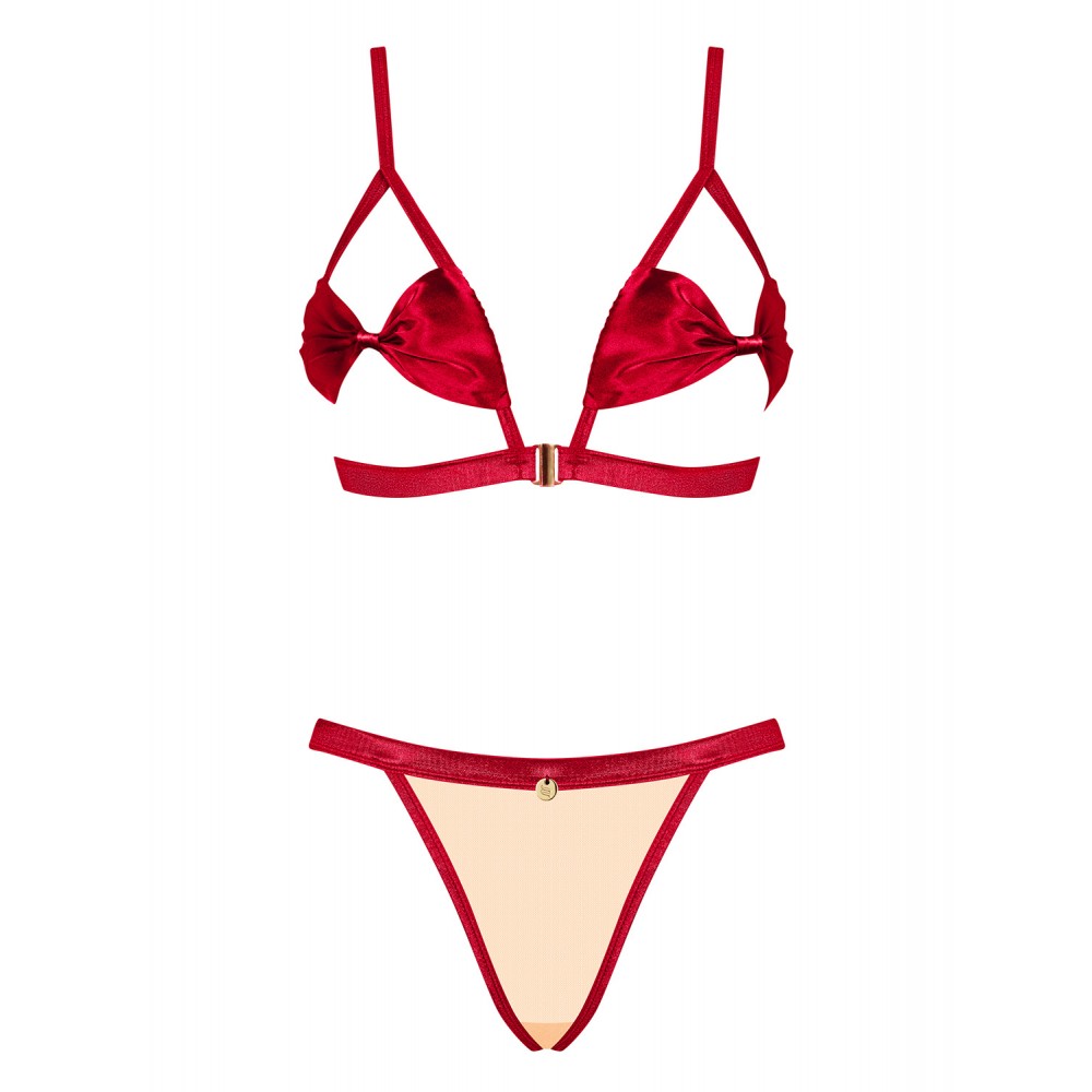 Надзвичайно мила нижня білизна... ніколи не буває забагато! І цей вам особливо сподобається! Надзвичайно привабливий і водночас нетрадиційно класичний. Ви побачите, наскільки привабливим є червоний колір. Набір Rubines запалить у вас вогонь бажання, підбадьорюючи вас бантиками на грудях і блискучими золотистими зв'язками. Ви, мабуть, уже з нетерпінням чекаєте наступної доставки від Obsessive... Б’єтесь об заклад, що він буде більше задоволений вашими покупками, ніж ви? Познайомтеся з цією інтригуючою моделлю ближче: спокусливий бюстгальтер і стрінги з ніжного атласу, регульовані бретелі – гарантія того, що все ідеально сидить частково відкриті чашечки ідеально підкреслюють груди Бюстгальтер на блискавці спереду чуттєві банти прикрашають бюст і сідниці стрінги з поєднання тканини тілесного кольору і червоного атласу насичений декор - металеві прикраси золотистого кольору і підвіска на ремінці, приємний на дотик, гнучкий матеріал (90% поліамід, 10% еластан)