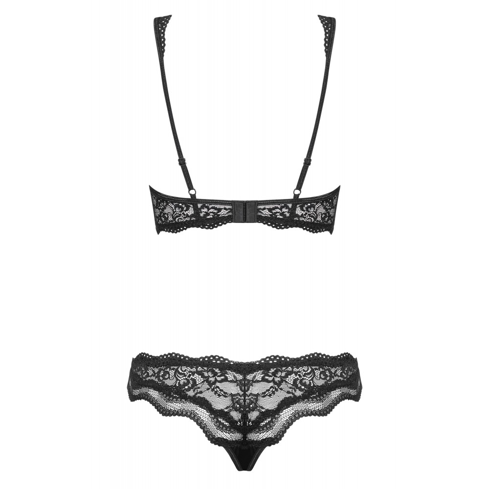 Спокусливі розрізи, сексуальні вирізи та витончені мережива, усе в насиченому чорному кольорі. Комплект Luvae - це квінтесенція чуттєвості з елегантним акцентом у вигляді маленької перлини, яка, як вишенька на торті, прикрашає дивовижний м'який бюстгальтер. Красиву форму грудей і ідеальну посадку гарантують кісточки, а регульовані бретелі і застібка забезпечують комфорт і зручність. Отже, ви будете спокушені? Детальніше: чорний комплект Luvae, м'який бюстгальтер на кісточках - ідеальна підтримка, регульовані бретелі і застібка - ідеальна посадка, мереживні стрінги в комплекті - красиве виділення сідниць, красива прикраса у вигляді кулона з бежевим камінчиком, ніжна і приємна на дотик. Touch, Multistretch матеріали (90% поліамід, 10% еластан)