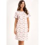 Жіноча бавовняна сорочка з візерунком з кіл та дрібних цяточок. Приємна на дотик, м'яка та еластична, вона забезпечує комфорт протягом усієї ночі, не обмежуючи рухів. Круглий виріз горловини, короткі рукави та довжина вище коліна. Склад: 100% бавовна.