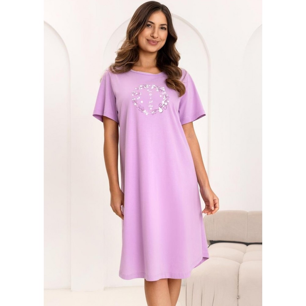 Жіноча бавовняна сорочка з принтом спереду. Приємна на дотик, м'яка та еластична, вона забезпечує комфорт протягом усієї ночі, не обмежуючи рухів. Круглий виріз, короткі рукави та довжина до коліна. Склад: 100% бавовна.