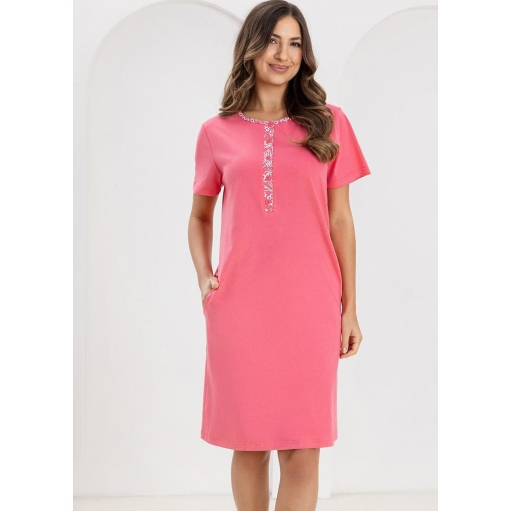 Жіноча бавовняна сорочка, однотонна. Приємна на дотик, м'яка та еластична, вона забезпечує комфорт протягом усієї ночі, не обмежуючи рухів. Має круглий виріз горловини, кишені на стегнах, короткі рукави та крій до коліна. Склад: 100% бавовна.