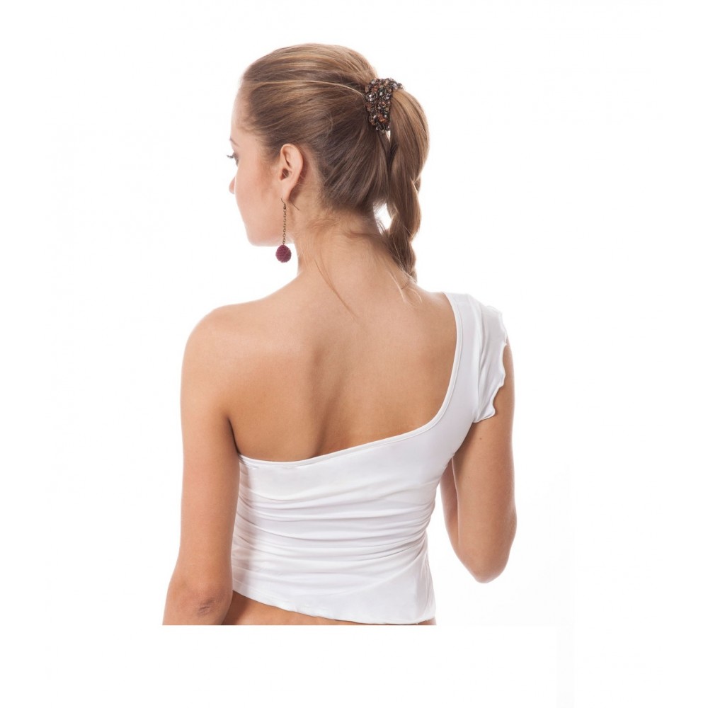 Жіноча футболка з одним рукавом та модним принтом. З рюшами з одного боку. Виготовлена з еластичних волокон, які ідеально облягають тіло, забезпечуючи комфорт. Склад: 100% поліестер.