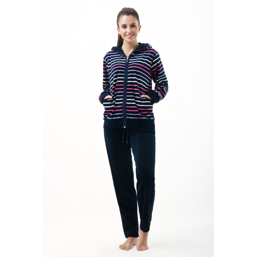 Цей жіночий велюровий спортивний костюм пропонує максимальний комфорт, елегантність та класичний вигляд, ідеально підходить для багатьох випадків. Цей жіночий спортивний костюм з горизонтальними смужками створює надзвичайно жіночний силует. Він має блискавку, зручні кишені та капюшон. Крій та оздоблення роблять його універсальним. Штанини спортивного костюма кольору індиго мають довгі, прямі штанини.