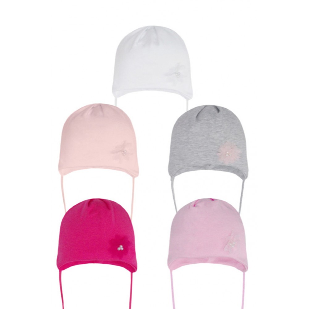 • Бавовняна шапка подвійної в'язки для дівчинки з тюлевою квіткою, прикрашеною перлами. Склад: 95% бавовна, 5% еластан..