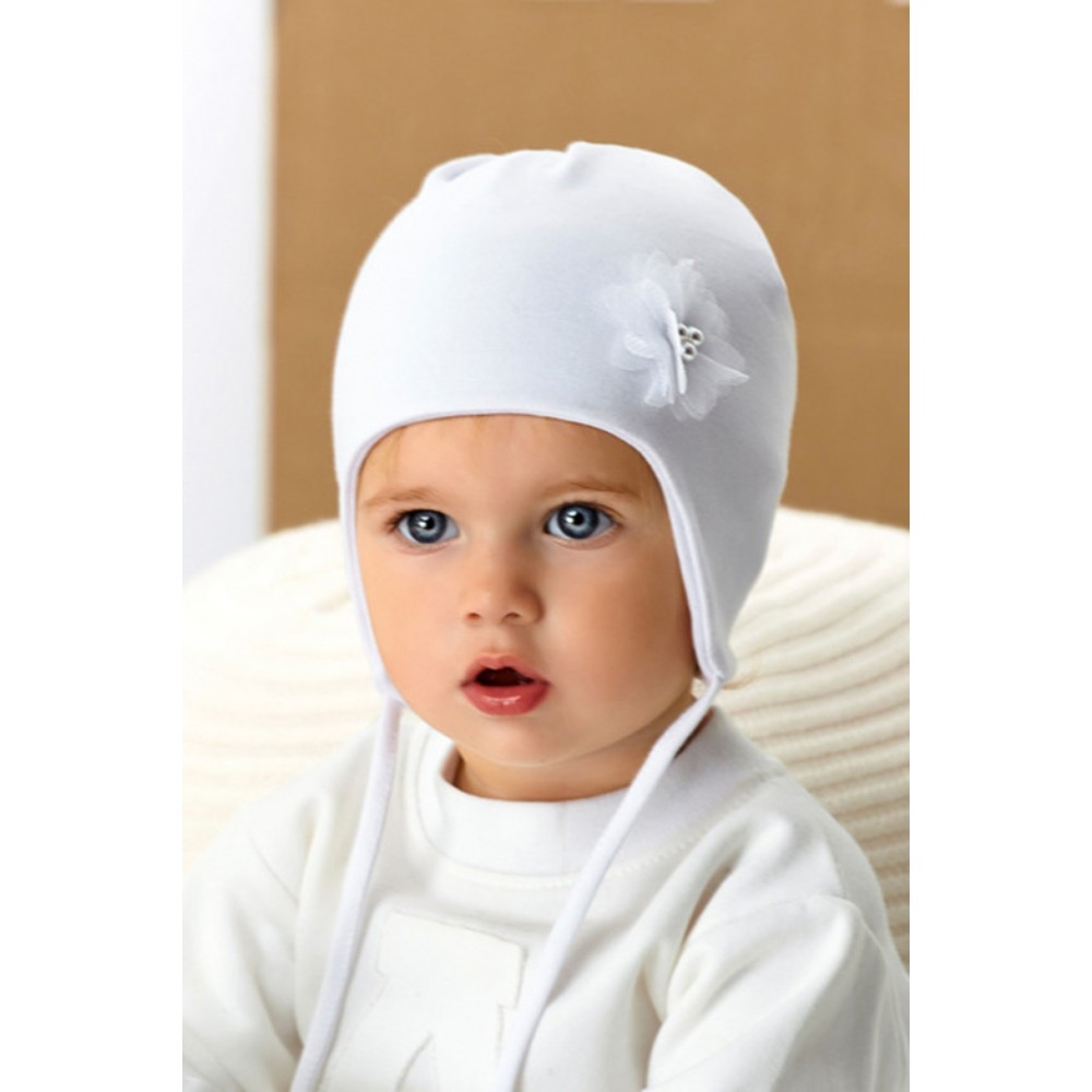 Бавовняна шапка подвійної в'язки для дівчинки з тюлевою квіткою, прикрашеною перлами. Склад: 95% бавовна, 5% еластан