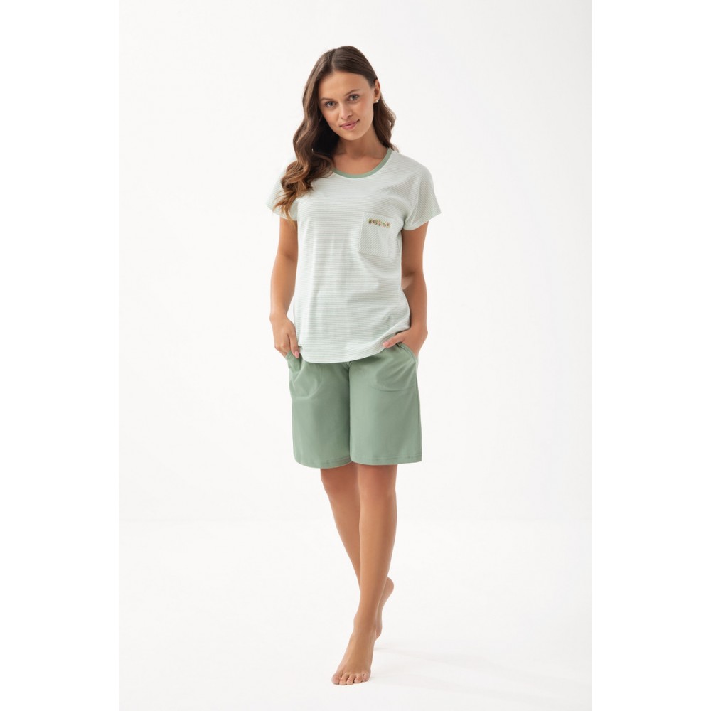 Жіноча піжама в смужку з короткими рукавами та круглим вирізом. Бермуди в тон з кишенями.
