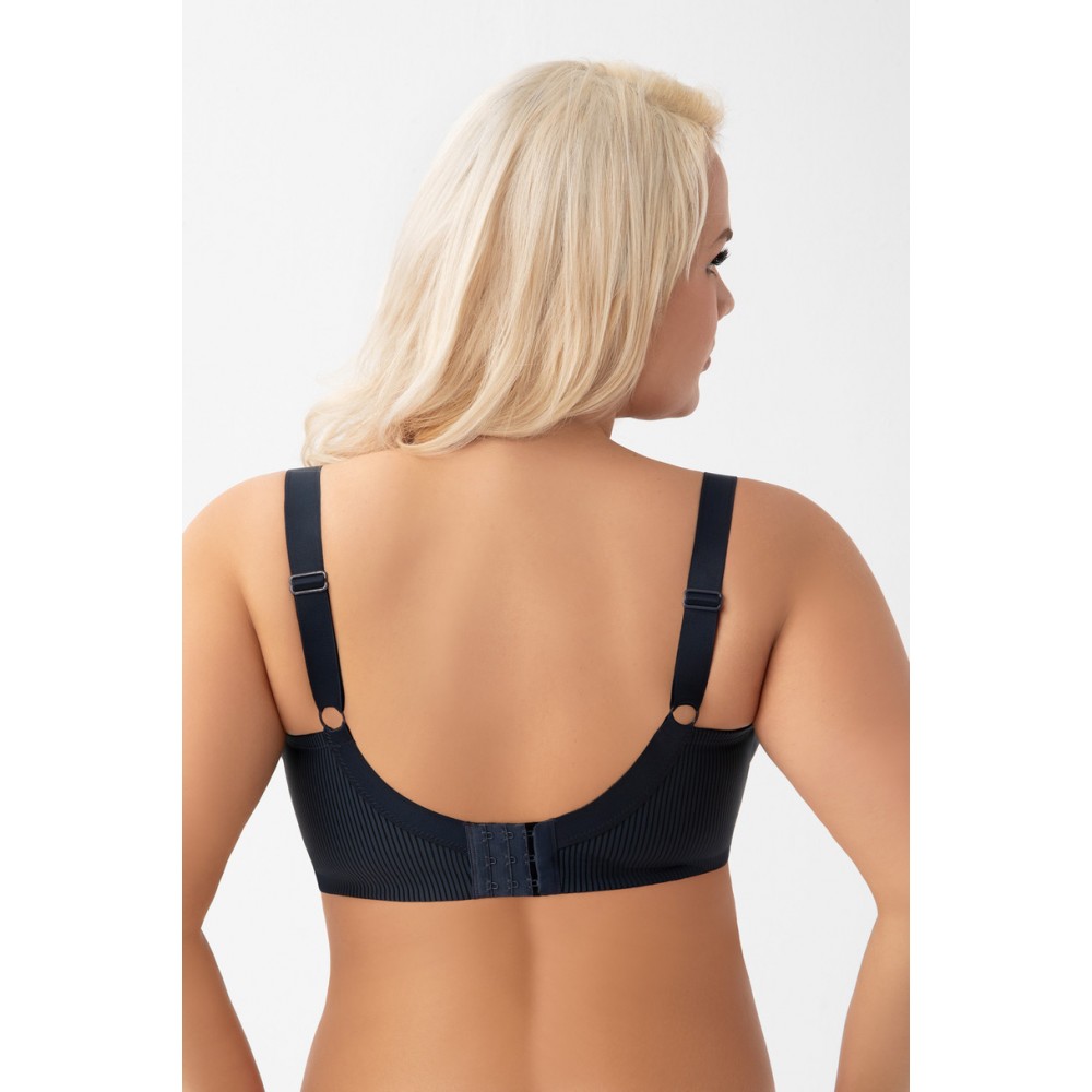 Він вирізняється модним вертикальним жакардовим візерунком і ніжною, прозорою сіточкою у верхній частині чашечок, що ледь помітно підкреслює декольте. Бюстгальтер має регульовані бретельки для індивідуальної посадки та класичну застібку-гачок ззаду.