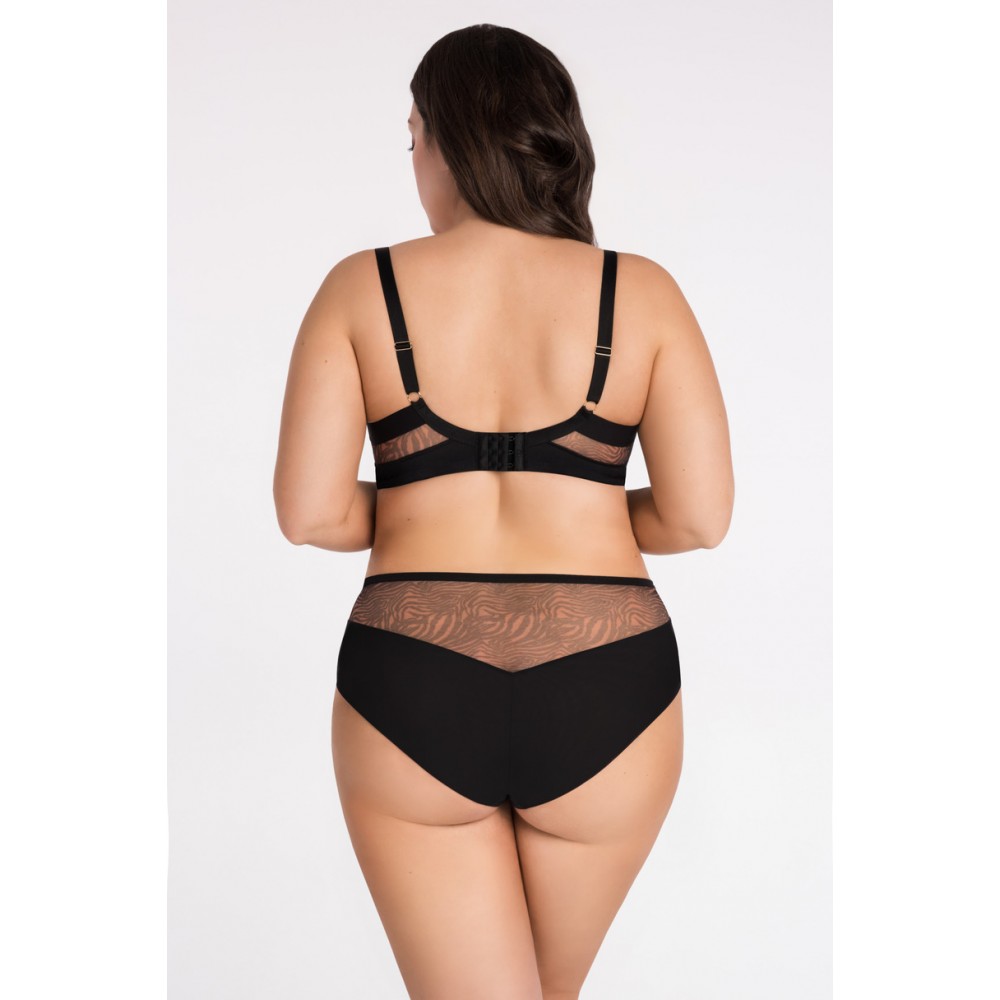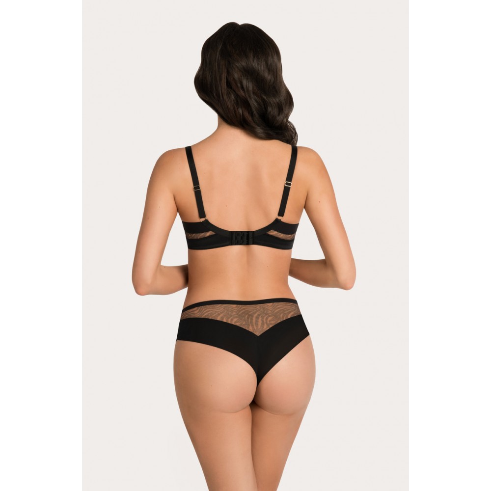 Biustonosz miękki przeznaczony dla kobiet ze średnim, dużym oraz bardzo dużym biustem. Zapewnia efekt bardzo mocnego uniesienia i zebrania biustu do środka, 3-częściowe miski wykonane z tiulu stabilnego. Szwy na miskach przykryte satynową taśmą ze zwierzęcym nadrukiem. Górna krawędź miski przechodzi płynnie do ramiączka powodując lepsze podtrzymanie biustu. Dla zwiększenia komfortu użytkowania biustonosz na plecach wykończony szeroką, miękką taśmą elastyczną. Fiszbiny boczne zapobiegające zwijaniu się materiału. W zależności od rozmiaru dwu lub trzyrzędowa haftka z trójstopniową regulacją obwodu.