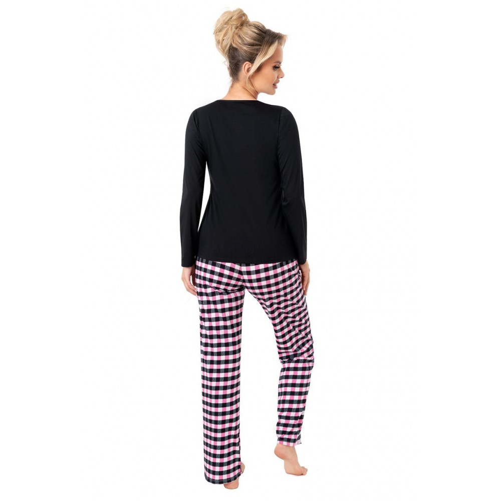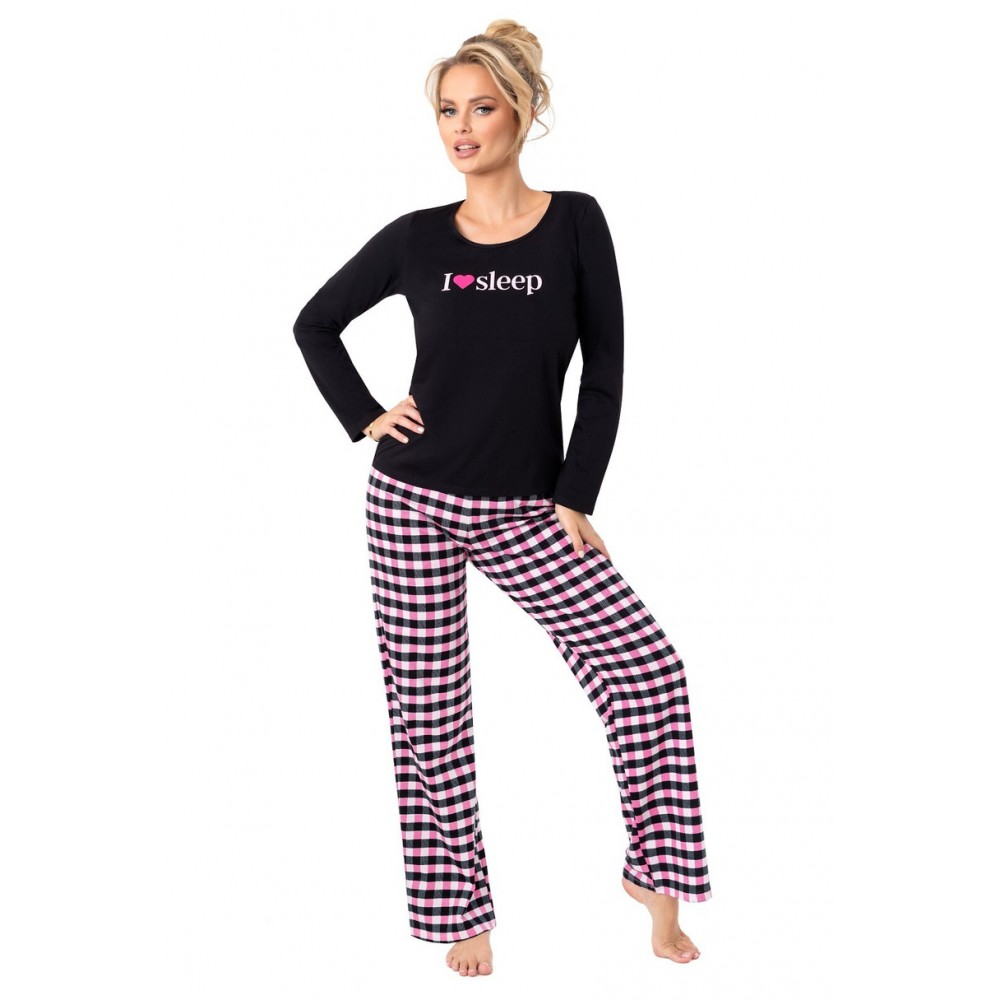Ця зручна жіноча піжама, виготовлена зі 100% високоякісної бавовни, ідеально підійде для прохолодних ночей. Класична футболка з довгими рукавами та круглим вирізом горловини прикрашена модним написом "I ♥ sleep", що додає шарму та підкреслює її легкий, жіночний характер. Комплект включає довгі, зручні штани у позачасовий картатий візерунок, які не тільки чудово виглядають, але й забезпечують свободу рухів та комфорт протягом усієї ночі. Натуральний матеріал робить піжаму м'якою, дихаючою та приємною на дотик. Комплект упакований у поліетиленовий пакет – також чудова ідея для подарунка.