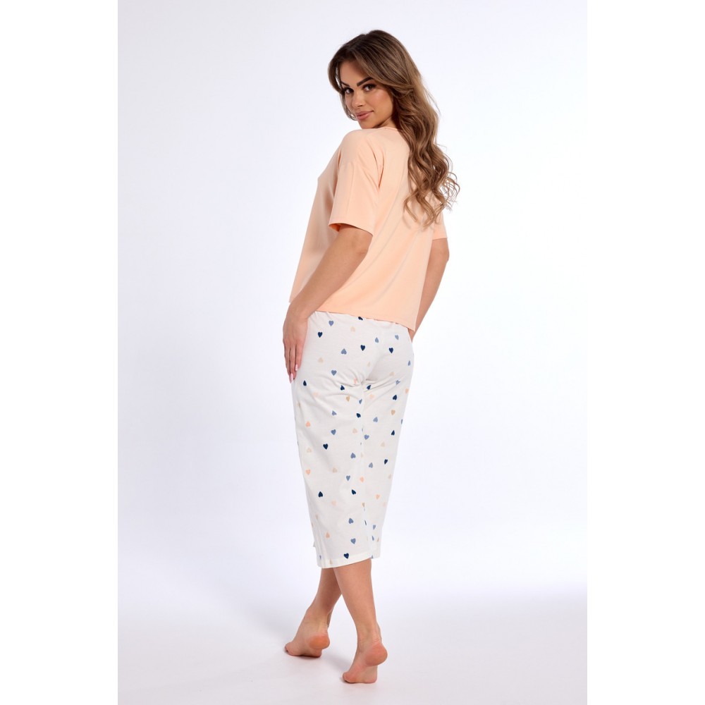 Оберіть комфорт та стиль із жіночою піжамою KR 798/306 Suzie Cornette , яка поєднує м'якість модалу з натуральною бавовною . Футболка з короткими рукавами, виготовлена з м'якого, дихаючого модалу , забезпечує максимальний комфорт. Круглий виріз підкреслює витончений характер, а капрі з візерунком у формі сердечок додають шарму. Зручний еластичний пояс та атласний бант забезпечують ідеальну посадку піжами. Це ідеальний вибір для теплих вечорів та відпочинку вдома!