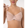 Бюстгальтер з м'якими чашками, внутрішня частина чашки дубльована сітчастим полотном. Виконаний з еластичного мережива з флоковою набивкою. Незнімні регульовані бретелі, бокова корегуюча деталь, застібка - гачки.
