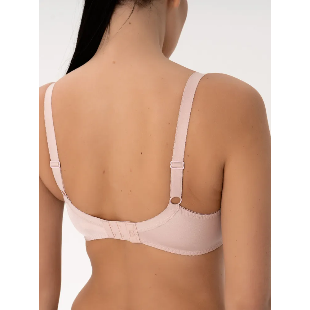 Бюстгальтер з м'якими чашками, внутрішня частина чашки дубльована сітчастим полотном. Виконаний з еластичного мережива з флоковою набивкою. Незнімні регульовані бретелі, бокова корегуюча деталь, застібка - гачки.