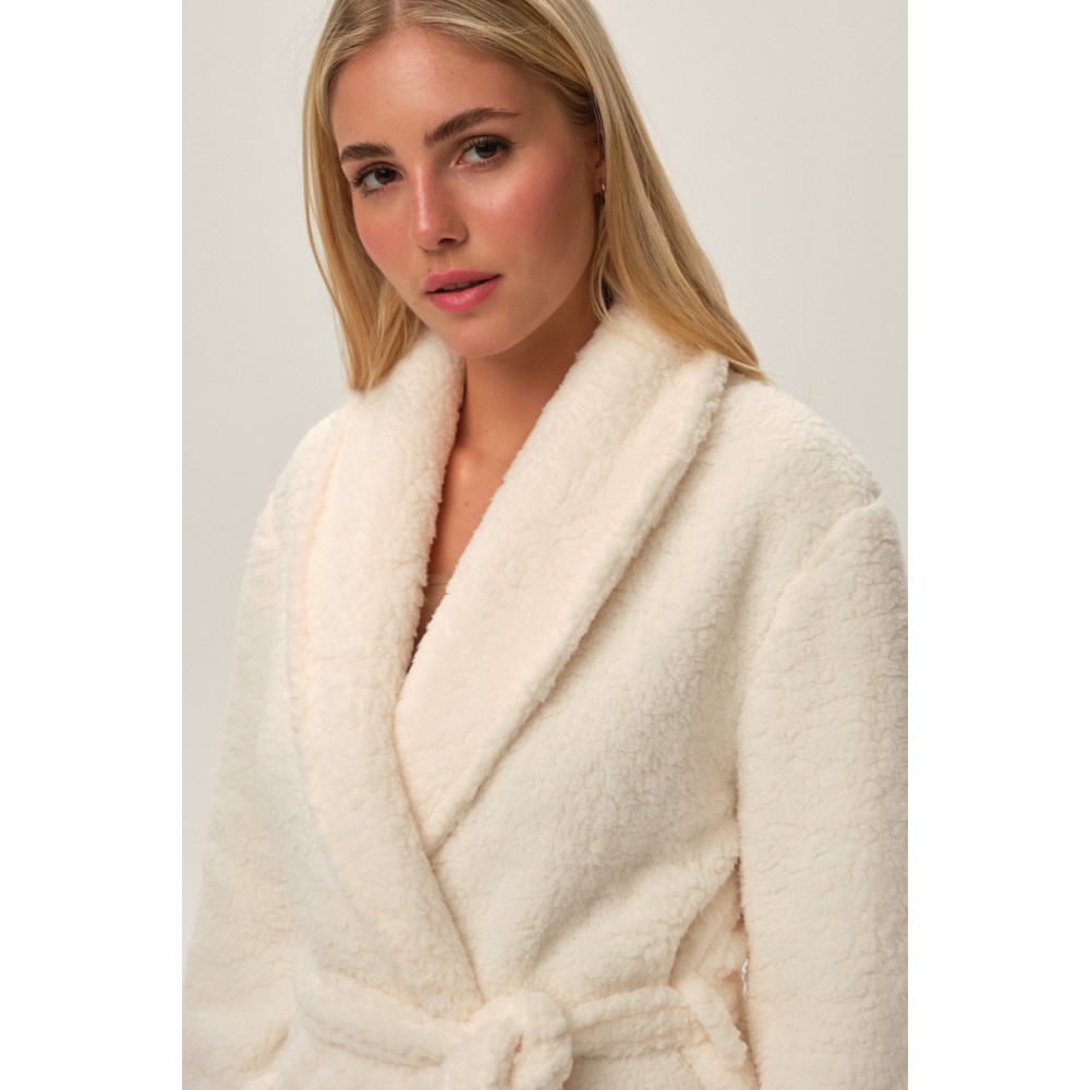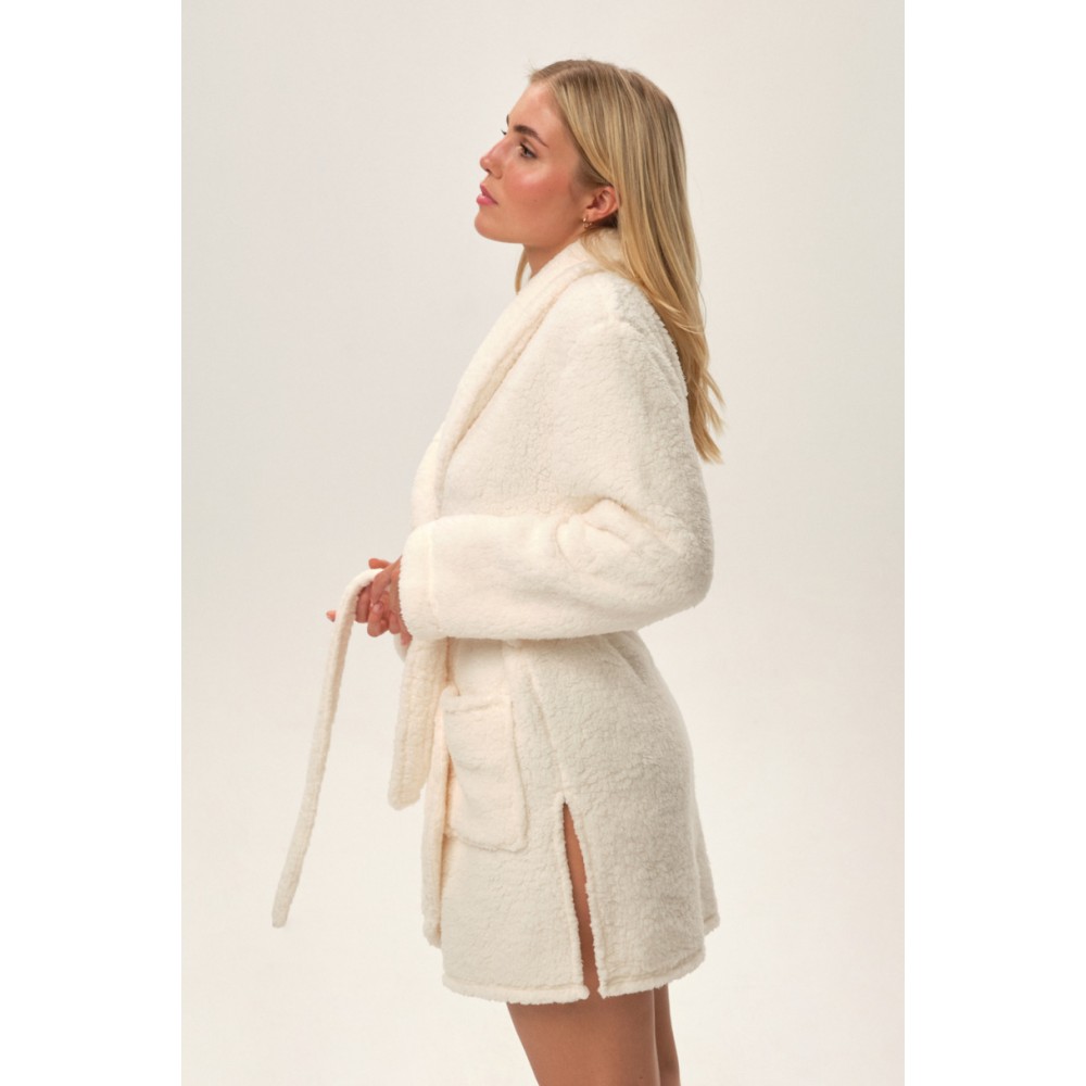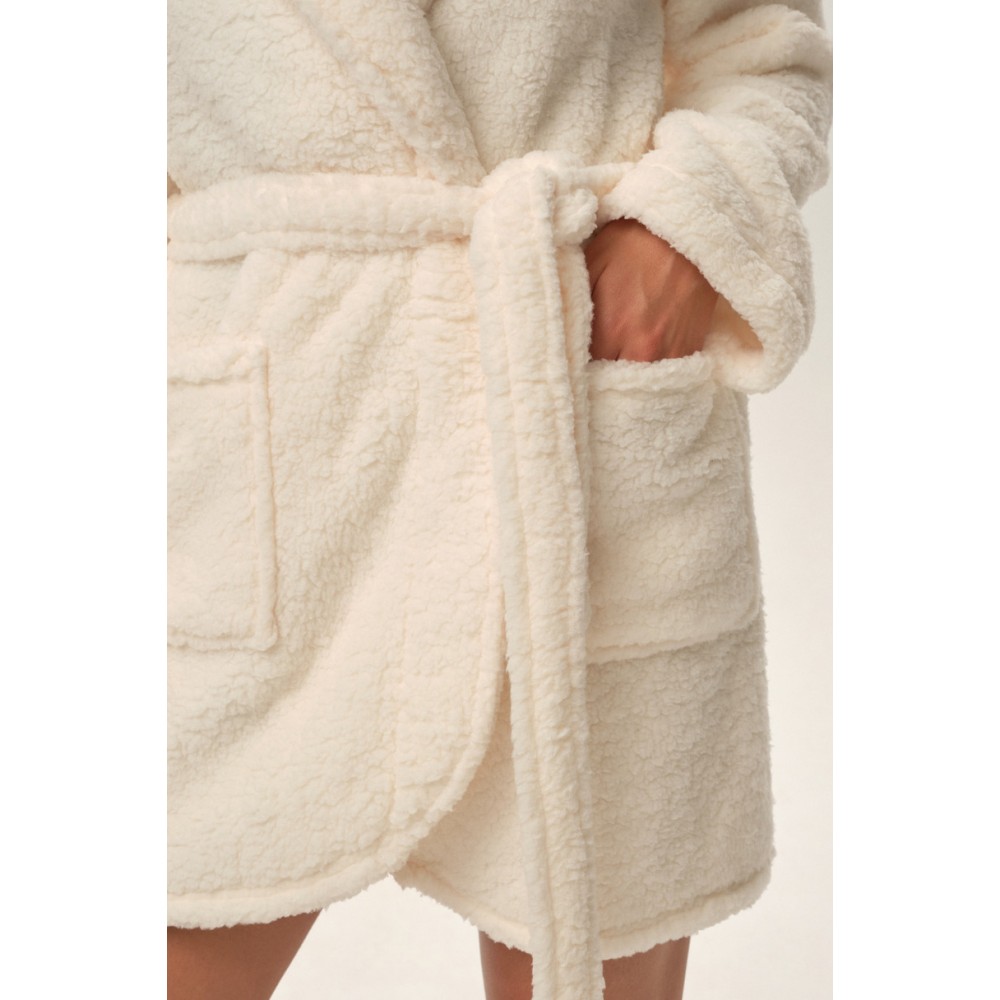 Жіночий халат з коміром. Довгі рукави, зав'язка на талії, дві зовнішні кишені, довжина до коліна.
